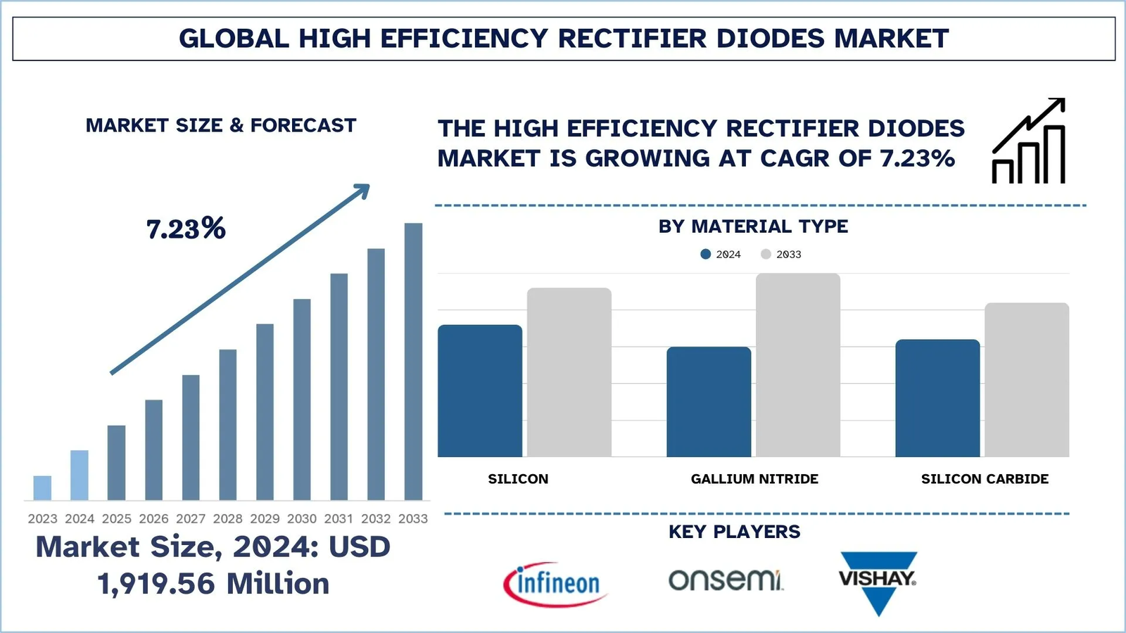 According to the UnivDatos, the rising demand for energy-efficient power electronics across EVs, data centers, and renewable energy systems is the major factor driving the growth of the High Efficiency Rectifier Diodes market worldwide. As per their “High Efficiency Rectifier Diodes Market” report, the global market was valued at USD ~1,919.56 million in 2024, growing at a CAGR of about 7.23% during the forecast period from 2025 - 2033 to reach USD million by 2033.