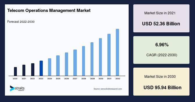 According to StraitsResearch, the global telecom operations management market size is valued at USD 52.36 billion in 2021 and is estimated to reach USD 95.94 billion by 2030, growing at a CAGR of 6.96% during 2022-2030.