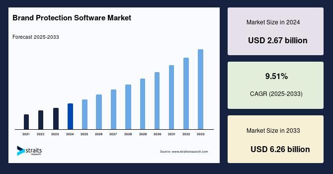 According to StraitsResearch, the global brand protection software market size is valued at USD 2.67 billion in 2024 and is estimated to reach USD 6.26 billion by 2033, growing at a CAGR of 9.51% during 2025-2033.