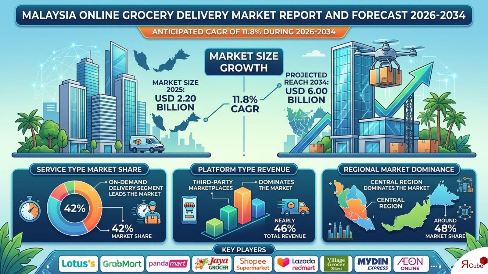 According to recent research report by The Report Cube, the size of Malaysia Online Grocery Delivery Market was nearly USD 2.20 Billion in 2025, and by 2034 it is expected to reach around USD 6.00 Billion with a CAGR of 11.8% over the forecast period (2026-2034).