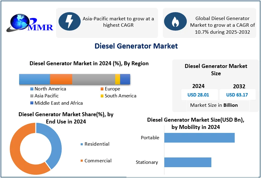 The Diesel Generator Market size was valued at USD 28.01 Bn. in 2024, and the total Diesel Generator Market revenue is expected to grow by 10.7% from 2024 to 2032, reaching nearly USD 63.17 Bn.