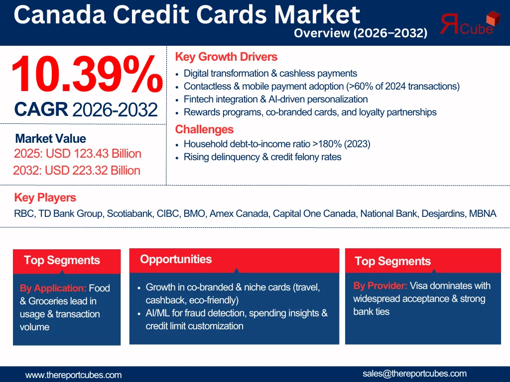 The Report Cube which is one of the leading market research company in UAE expects the Canada Credit Cards Market to grow at a CAGR of around 10.39% through 2032, as highlighted in their latest research report. The study provides an in-depth analysis of the emerging trends shaping the Canada Credit Cards Market and offers detailed forecasts for its potential growth during 2026–2032. The report also presents a comprehensive assessment of the competitive landscape, including profiles of leading players, their performance metrics, and recent strategic developments. Additionally, it explores the key market drivers, challenges, opportunities, and provides insights into historical and future revenue trends at the global, regional, and country levels.