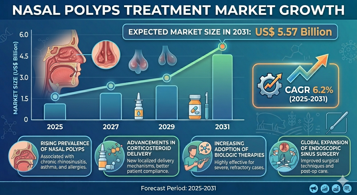 The Nasal Polyps Treatment Market is experiencing steady growth, driven by the rising prevalence of chronic rhinosinusitis and associated inflammatory conditions. According to industry insights, the market is projected to register a significant CAGR during the forecast period from 2025 to 2031. Factors such as increasing healthcare expenditure, advancements in biologic therapies, and growing demand for targeted treatment options are contributing to the expansion of the Nasal Polyps Treatment Market. Additionally, the shift toward personalized medicine and improved diagnostic capabilities is enhancing treatment outcomes and supporting overall growth.