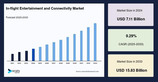 According to StraitsResearch, the global in flight entertainment and connectivity market size was valued at USD 7.11 billion in 2024 and is estimated to reach USD 15.83 billion by 2033, growing at a CAGR of 9.29% during 2025-2033.