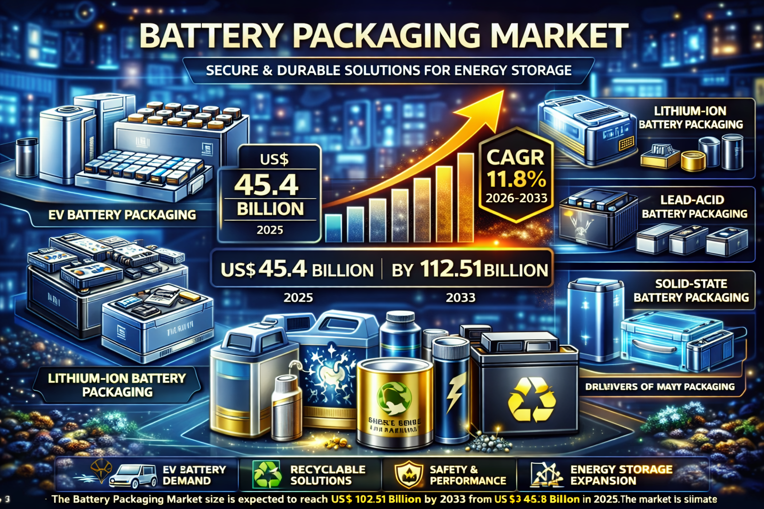 The Battery Packaging Market size is expected to reach US$ 112.51 Billion by 2033 from US$ 45.4 Billion in 2025. The market is estimated to record a CAGR of 11.8% from 2026 to 2033. This robust growth is fueled by the rising production of lithium-ion batteries and the increasing stringency of international safety regulations for the transport of dangerous goods.