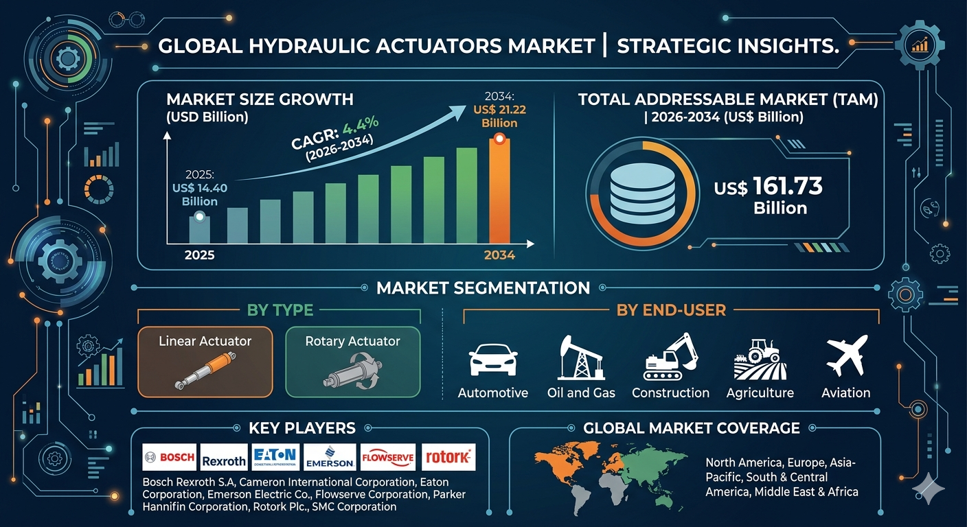 The Hydraulic Actuators Market Size is experiencing steady growth driven by increasing industrial automation and infrastructure development worldwide. The hydraulic actuators market size is expected to reach US$ 21.22 Billion by 2034 from US$ 14.40 Billion in 2025, registering a CAGR of 4.4% during the forecast period 2026–2034. This growth reflects the expanding use of hydraulic systems in heavy-duty industrial operations, aerospace applications, and construction equipment where high power density and reliability are essential.