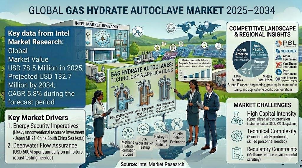 According to a new report from Intel Market Research, the global Gas Hydrate Autoclave market was valued at USD 78.5 million in 2025 and is projected to reach USD 132.7 million by 2034, growing at a CAGR of 5.8% during the forecast period. This steady growth trajectory reflects increasing R&D investments in unconventional energy sources and expanding applications in flow assurance testing across oil & gas operations.