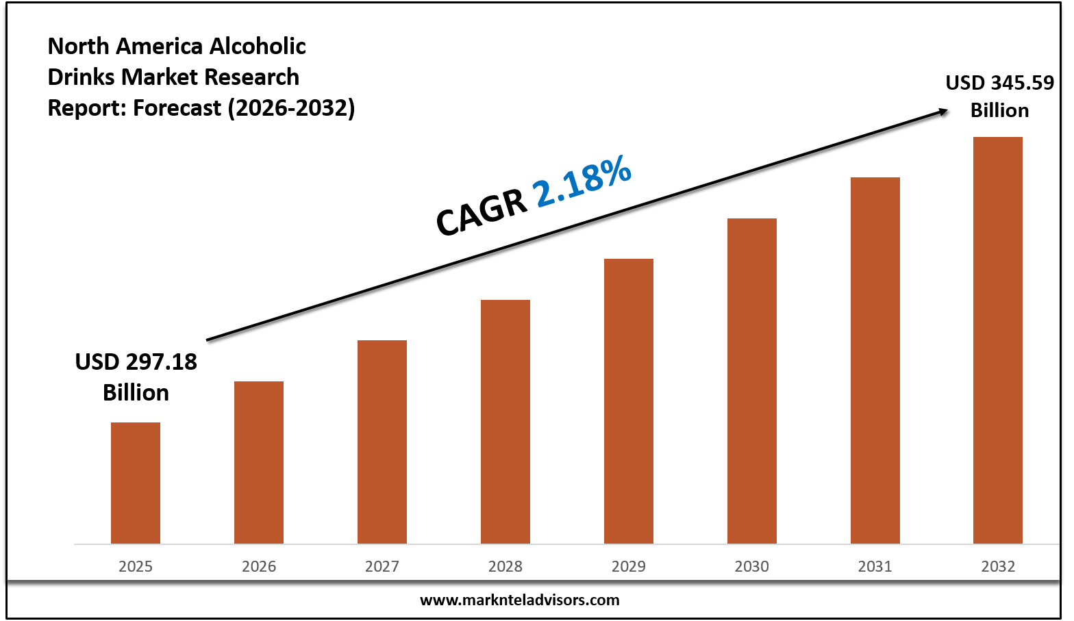As per MarkNtel Advisors the North America Alcoholic Drinks Market size is valued at around USD 297.18 billion in 2025 and is projected to reach USD 345.59 billion by 2032. Along with this, the market is estimated to grow at a CAGR of around 2.18% during the forecast period, i.e., 2026-32.