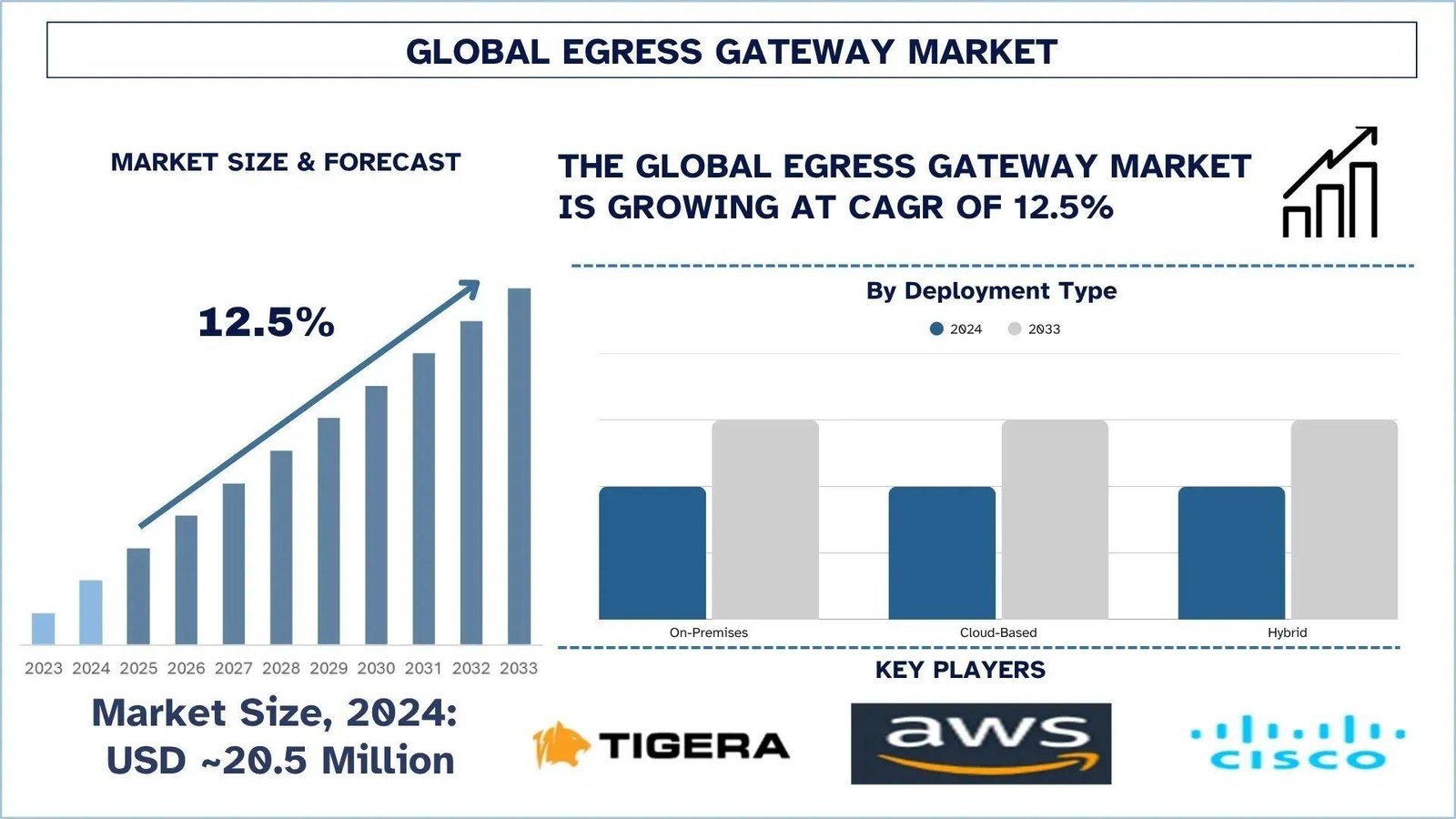 According to UnivDatos analysis, rising global threats of data exfiltration and cyberattacks, increasing demand for secure egress points, coupled with the proliferation of hybrid and multi-cloud environments and rising mergers and acquisitions, are the major factors driving the growth of the egress gateway market. As per their “Egress Gateway Market” report, the global market was valued at USD ~20.5 million in 2024, growing at a CAGR of about 12.5% during the forecast period from 2025 - 2033 to reach USD million by 2033.