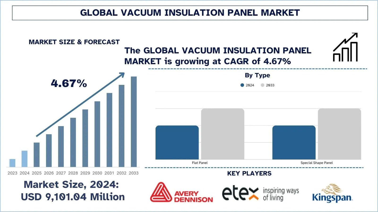 According to the UnivDatos, as per their “Vacuum Insulation Panel Boiler Market” report, the global market was valued at USD 9,101.04 million in 2024, growing at a CAGR of about 4.67% during the forecast period from 2025 - 2033 to reach USD million by 2033.