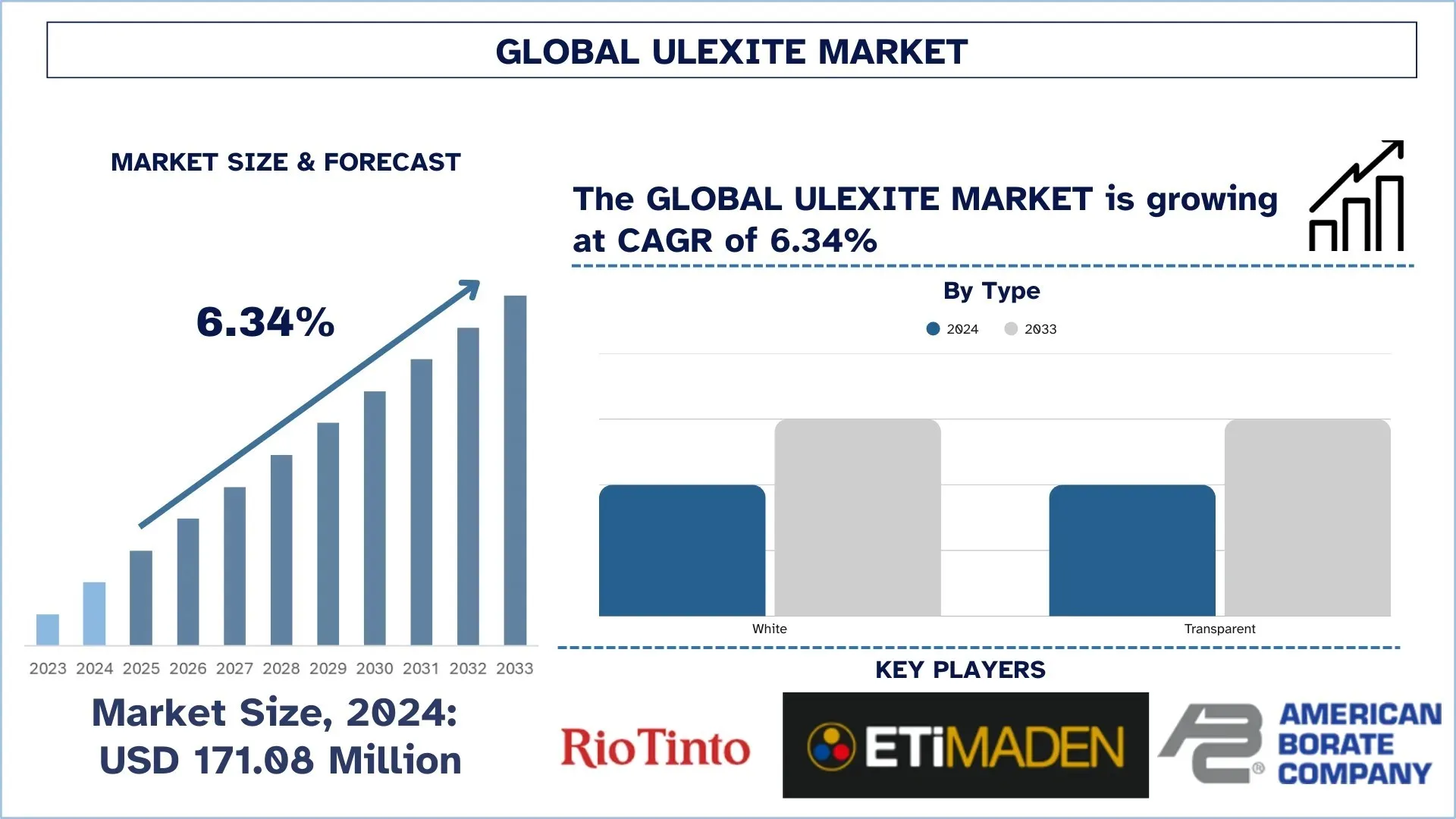 According to a new report by UnivDatos, The Global Ulexite Market was valued at USD 171.08 million in 2024 and is expected to grow at a CAGR of around 6.34% during the forecast period (2025–2033F).