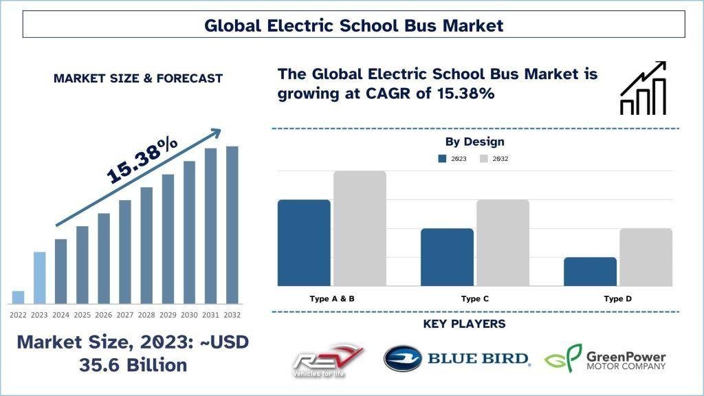 The global electric school bus market was valued at USD 35.6 billion in 2023 and is expected to grow at a CAGR of 15.38% from 2024 to 2032, reaching USD XX billion by 2032.